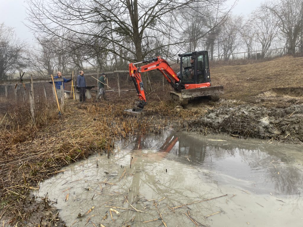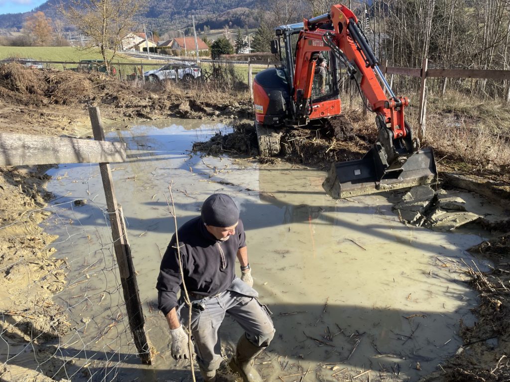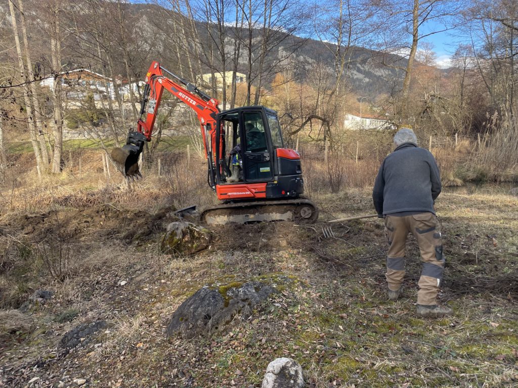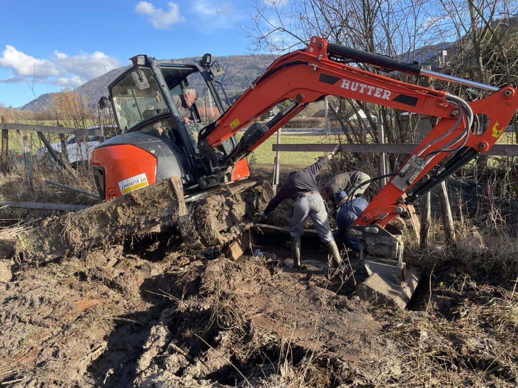Profitant de la location de la rétropelleteuse, nous avons entrepris des travaux d’entretien dans la réserve communale des Préaies gérée par notre club sue puis sa création en 1989. En l’absence du machiniste José, c’est Jean-Daniel qui était à la manoeuvre.