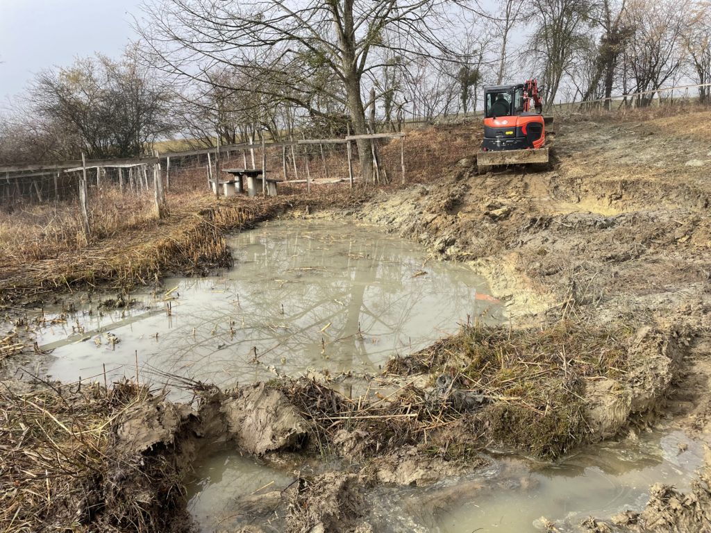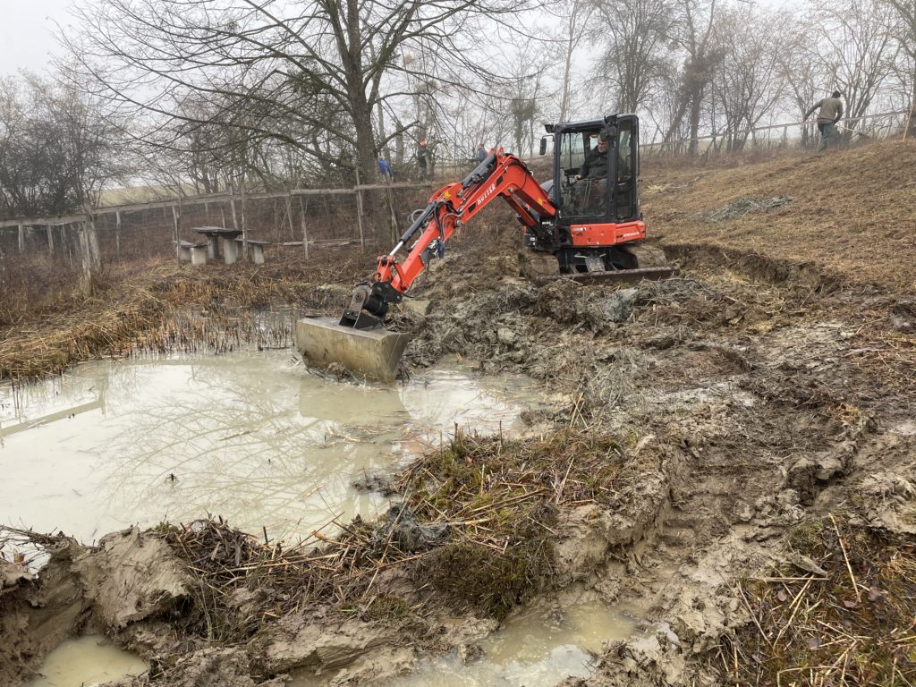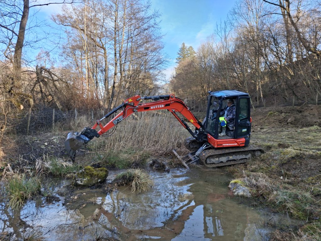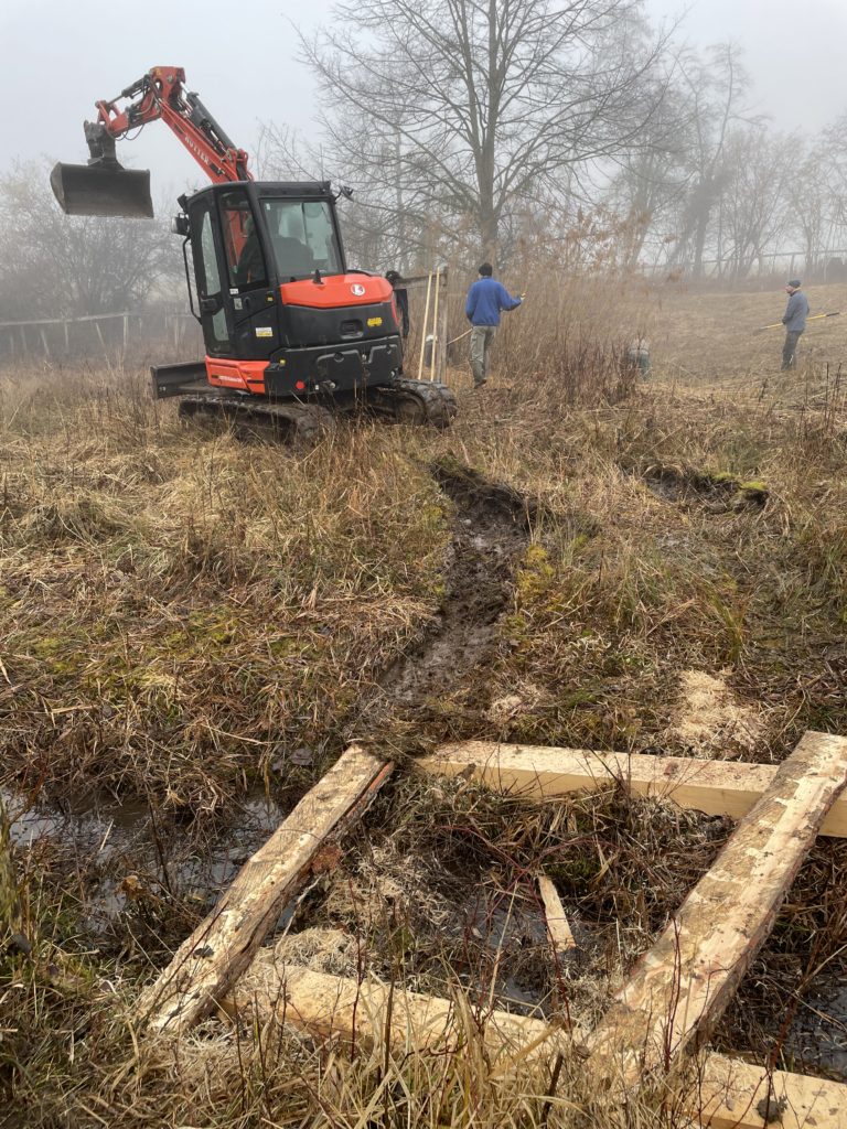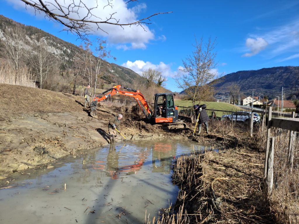 Profitant de la location de la rétropelleteuse, nous avons entrepris des travaux d’entretien dans la réserve communale des Préaies gérée par notre club sue puis sa création en 1989. En l’absence du machiniste José, c’est Jean-Daniel qui était à la manoeuvre.