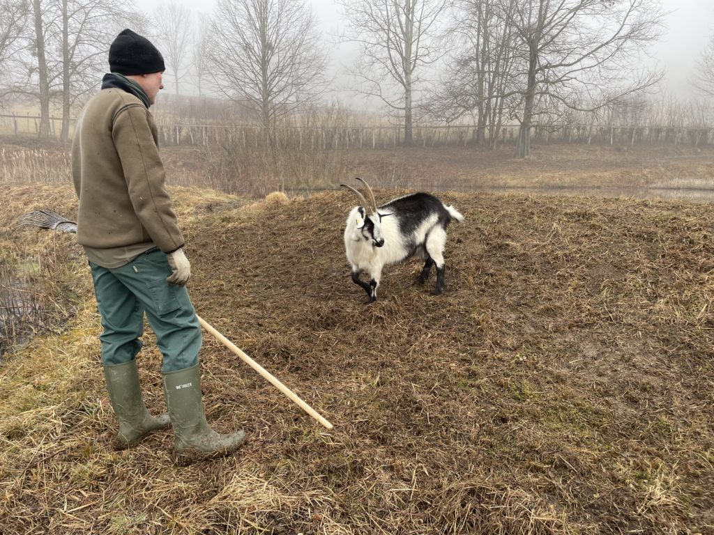 Deux chèvres assurent actuellement l’entretien du milieu et le contrôle des rejets d’aulnes et autres ligneux indésirables.