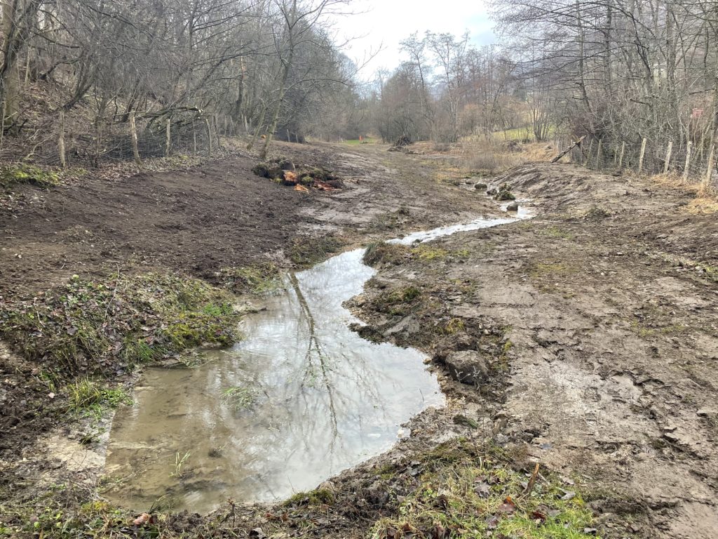 – Réaménagement du ruisselet et de petites gouilles pour favoriser la présence et la reproduction d’espèces emblématiques comme la salamandre tachetée (amphibien) ou l’orthétrum bleuissant (odonate)